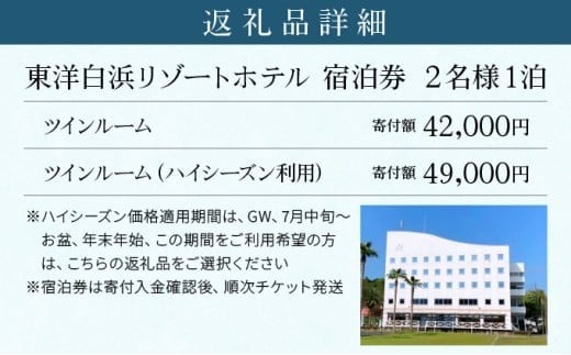 - 東洋白浜リゾートホテル 宿泊券 TWルーム 2名様1泊