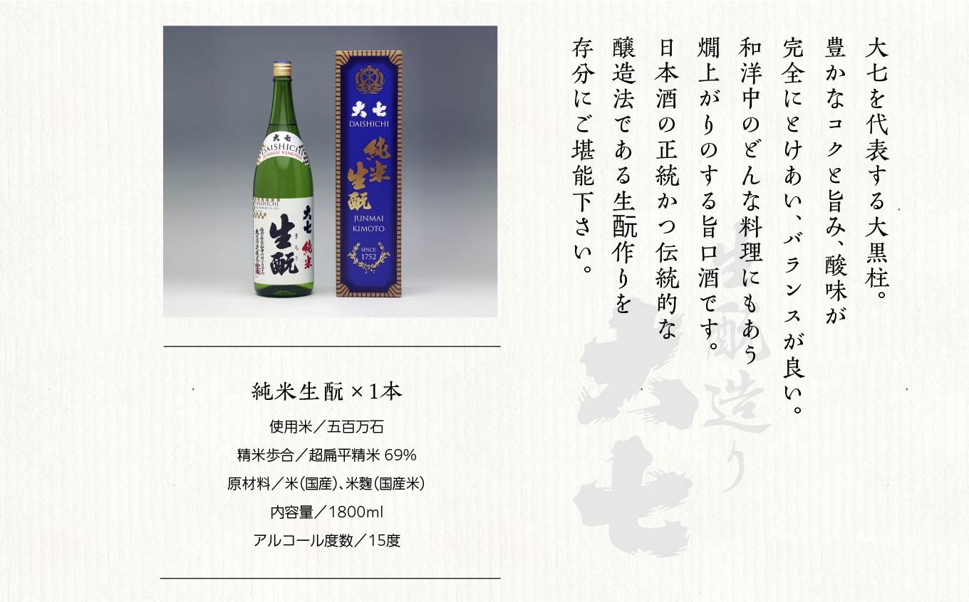 大七酒造「純米生酛」1800ml×1本 大七 日本酒 酒 アルコール 純米 生もと 酒造 酒蔵 さけ おすすめ お中元 お歳暮 ギフト 送料無料 二本松市 ふくしま 福島県 送料無料【道の駅「安達」智恵子の里】