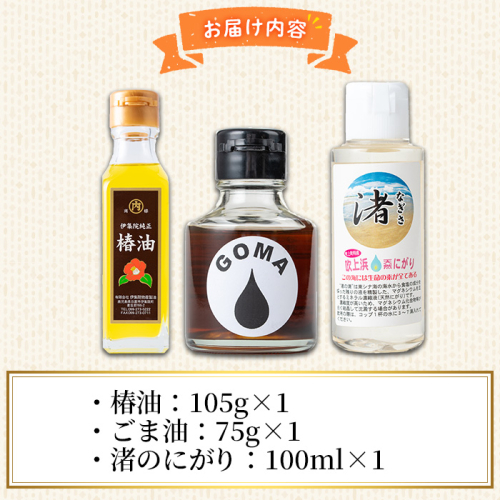 - No.1083 <数量限定>ふるさと食油セット!椿油(105g×1)・ごま油(75g×1)・渚のにがり(100ml×1) 油 オイル ヘアケア ドレッシング 胡麻油 ゴマ油 調味料【日置市観光協会】
