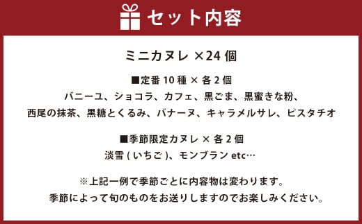 - ガトーミュール ミニカヌレ 24個入 (定番10種+季節のカヌレ2種 計24個)スイーツ お菓子 おやつ ミニ カヌレ 洋菓子 ギフト バニーユ ショコラ カフェ 黒ごま 黒蜜きな粉 抹茶 黒糖 くるみ バナーヌ キャラメルサレ ピスタチオ 淡雪 いちご モンブラン 冷凍