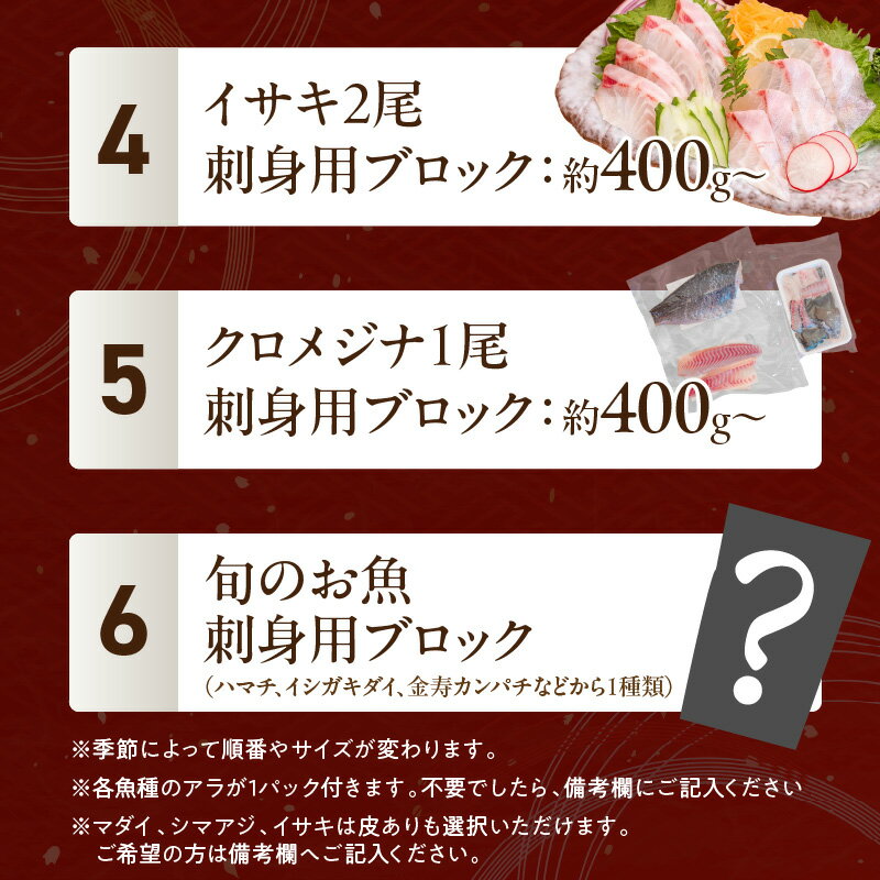 - 【ふるさと納税】【6ヶ月定期便】 冷蔵 結城水産 お魚勢ぞろい お刺身用ブロック 金寿カンパチ マダイ 旬 魚 刺身 ブロック シマアジ イサキ クロメジナ ハマチ イシガキダイ アラ 付き 選べる 皮あり 皮なし 魚介類 お取り寄せ お取り寄せグルメ 宮崎県 延岡市 送料無料