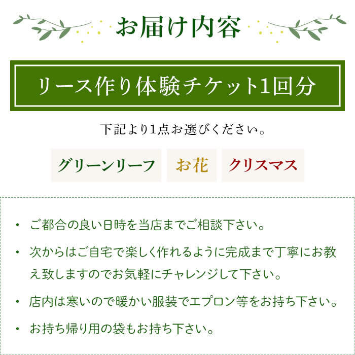【ふるさと納税】<選べる3タイプ>リース作り体験チケット(1回分) リース作り 体験 チケット ハンドメイド ワークショップ クラフト教室 グリーンリース フラワーリース クリスマスリース 手作り体験 インテリア 初心者歓迎 親子体験 新登場 【m56-02】【Porte-Bonheur】