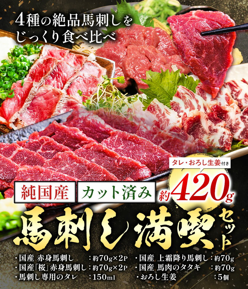 【ふるさと納税】純国産 カット済 馬刺し 満喫 セット 4種 約420g おろし生姜 馬刺し専用タレ付き 株式会社ワンエイト《30日以内に出荷予定(土日祝除く)》熊本県 苓北町 国産 上霜降り 赤身 タタキ 霜降り まな板不要 カット済み 生姜 タレ付き【配送不可地域あり】