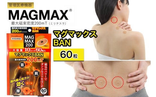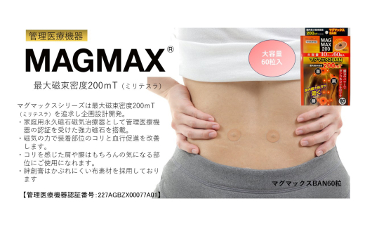 - 管理医療機器 マグマックスBAN [60粒] コリ・血行促進に効く 凝っている場所に貼るタイプ 最大磁束密度200mT 磁気絆創膏 布タイプ [0908]