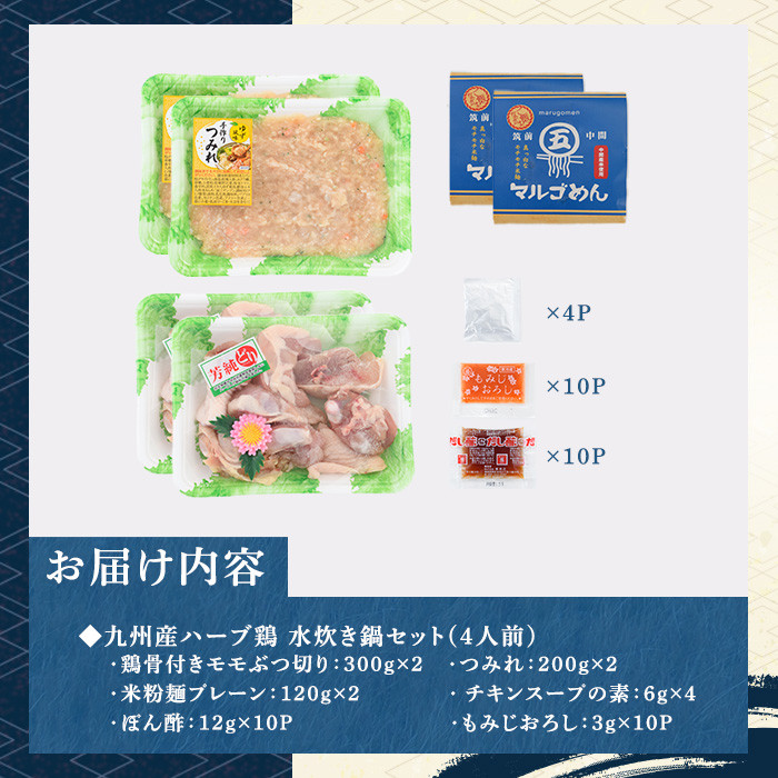 - 九州産ハーブ鶏 水炊き鍋(計4人前・2人前×2セット) 福岡 鶏肉 鳥肉 お肉 肉 水炊き みずたき 鍋 鍋セット セット 国産 鶏もも 骨付き もみじおろし ポン酢 米粉麺 米麺 【マル五】as06-030