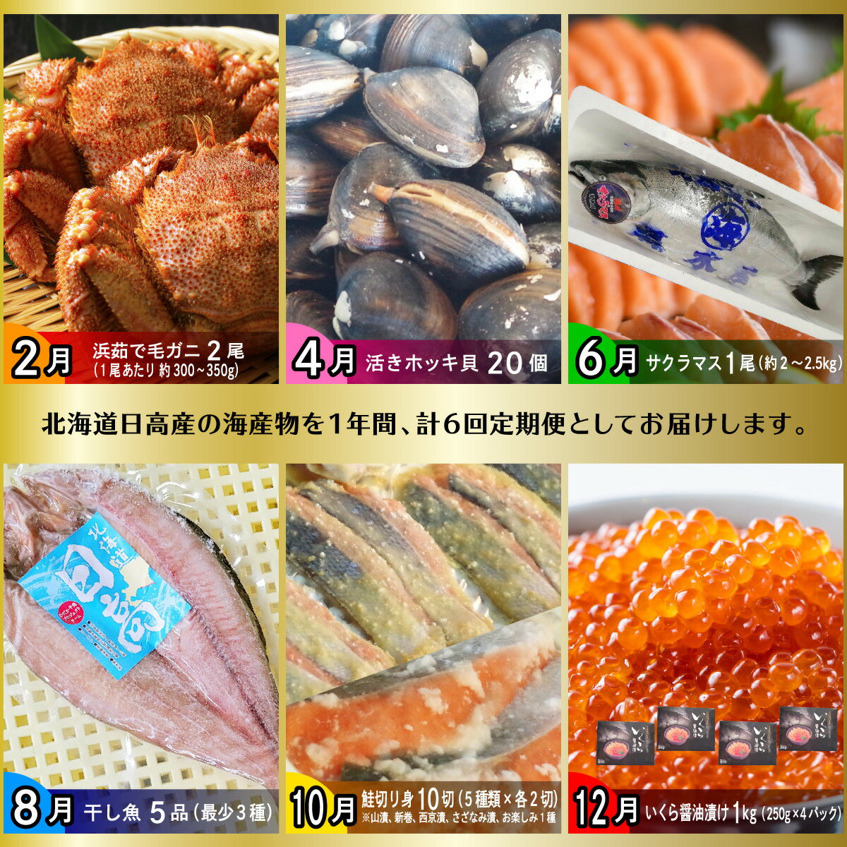 - 【ふるさと納税】<2026年2月から発送>< 定期便 6回 > 北海道産 海の幸 定期便 毛ガニ ホッキ サクラマス 干し 魚 鮭切り身 いくら イクラ カニ かに 毛蟹 蟹 北寄 貝 さくらます ます マス 本マス さけ サケ 鮭卵 旬 魚介 魚貝 海鮮 海産物 冷蔵 冷凍 北海道 新ひだか町