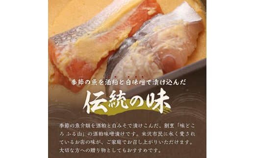 【 ギフト 】 季節のお魚 西京漬け 「 ふる山漬 」 1箱 3~4種 4パック ( 1パック 2切 ) 酒粕味噌漬け 銀鱈 鰆 鰤 銀むつ 鮭 つぼ鯛 など 漬け魚 山形 地元グルメ 贈答 ギフト 山形県 米沢市