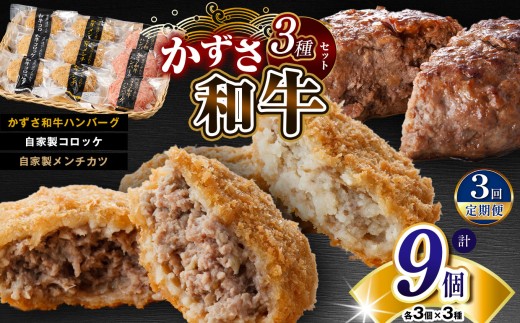 【 定期便 3回 】 肉総菜 3種セット 詰合せ 各3個 合計9個(和牛コロッケ・和牛 メンチ・かずさ和牛 ハンバーグ) 国産 和牛 お肉屋さんの手作り | かずさ和牛工房 上総和牛メディアで紹介される人気店! ジャパンフードセレクション 金賞 肉専門店 牛肉 牛 肉 にく 国産 メンチカツ お惣菜 セット おつまみ 揚げ物 オススメ 千葉県 君津市 きみつ 【AKMKH-3】