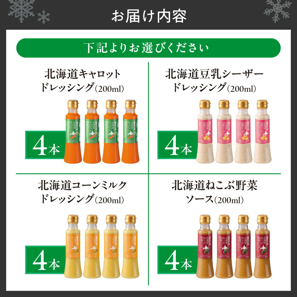 - 【ふるさと納税】 ドレッシング ソース 【 選べる 種類 】 4本セット 200ml キャロット コーンミルク 豆乳シーザー ねこぶ野菜 北海道産 人参 玉ねぎ ニンニク とうもろこし チーズ ねこぶだし 胡麻 ごま 味比べ 食べ比べ 旨み 北海道 札幌市