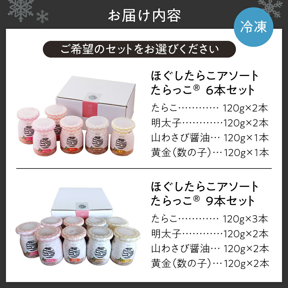 - 【ふるさと納税】 たらこ ほぐし アソート 【 選べる セット 】 6本 720g 9本 1080g たらっこ(R) 明太子 山わさび醤油 数の子 スケソウダラの卵 冷凍 化粧箱入り 良い粒立ち ご飯のお供 アレンジ 時短 魚貝 ギフト 贈り物 贈答 北海道 札幌市
