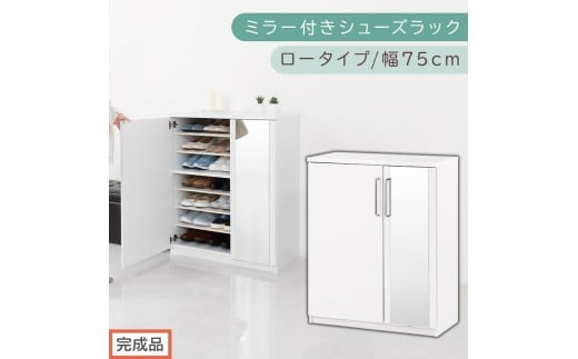 【完成品でお届け】ミラー付きシューズラック ロータイプ 幅75cm(ホワイト)シューズボックス ミラー付き ロータイプ 日本製 国産 シューズラック 大容量 ミラー 姿見 鏡 靴 収納 靴箱 シューズ ブーツ 玄関収納 木製 北欧 おしゃれ SKANBM175030-0-WH
