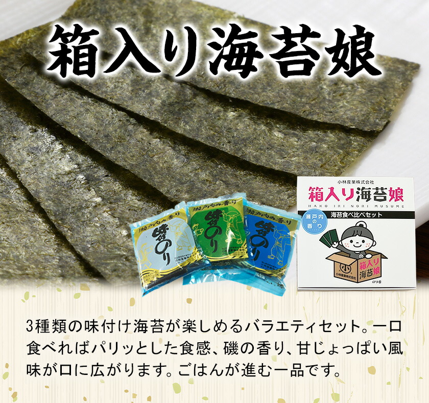 - 味付けもみのり 箱入り海苔娘(海苔食べ比べセット) 各1個 小林産業株式会社《45日以内に出荷予定(土日祝を除く)》岡山県 笠岡市 海苔 のり 味付海苔 味付のり 味のり もみのり 食べ比べ ごはんのお供 海産物 乾物 おにぎり おつまみ---K-62---