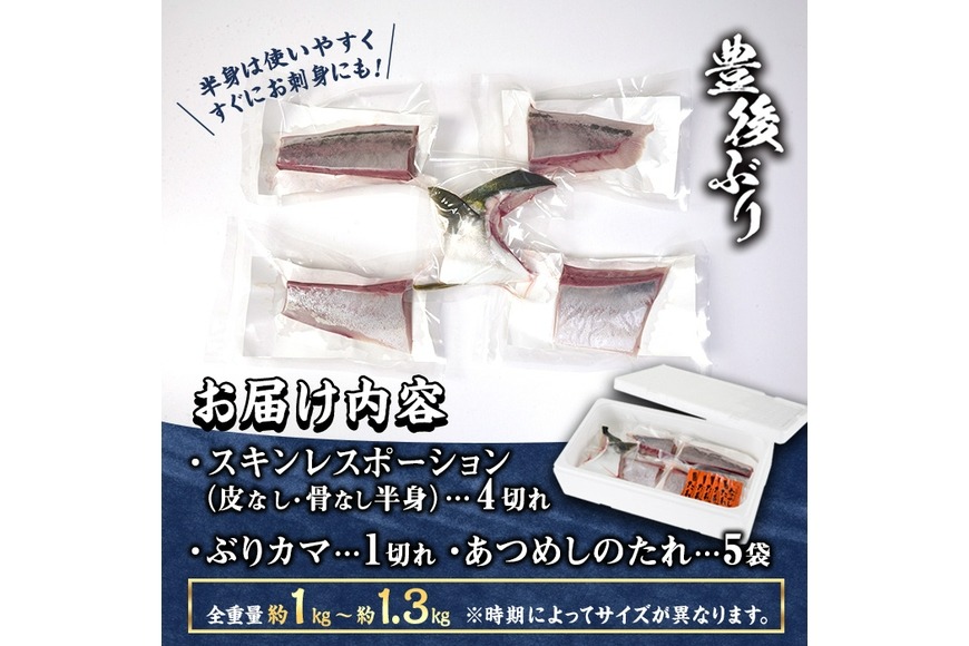 <先行予約受付中!2025年12月に順次発送予定>豊後ぶり半身セット (合計1kg以上・スキンレスポーション×4切れ・ブリカマ×1切れ・あつめしのタレ×5袋) 簡単調理 鰤 皮なし 骨なし 小分け 真空パック 刺身 さしみ 刺し身 塩焼き【GD001】【東海シープロ】