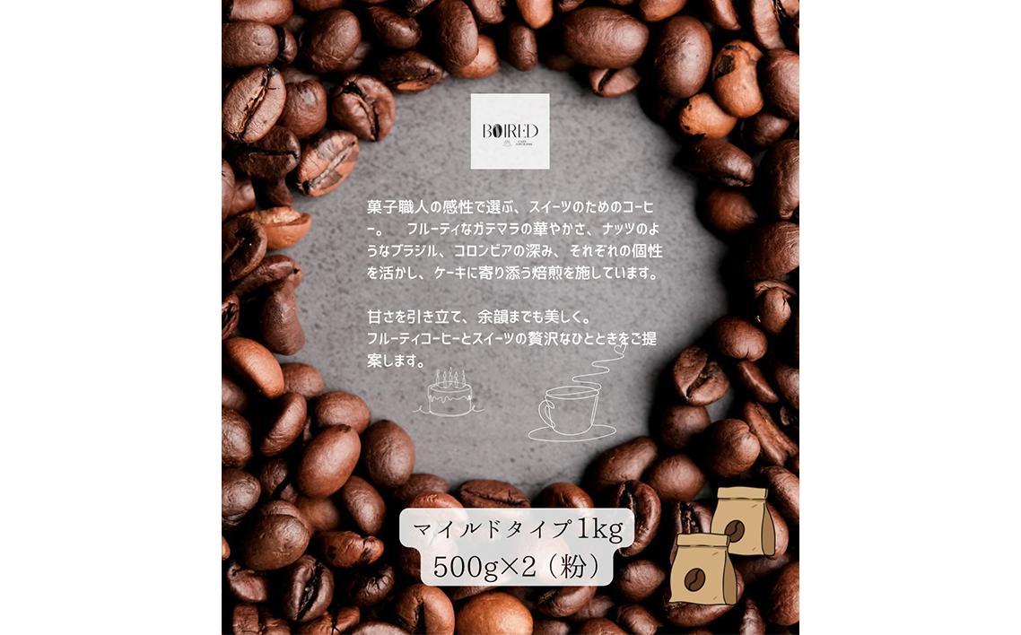 自家焙煎コーヒー マイルドタイプ【粉】 1000g(500g×2袋) / 珈琲 コーヒー 粉 厳選 焙煎 芳醇 マイルド ドリップ コーヒー豆 スペシャルティコーヒー オリジナル ブレンド ボワード 洋菓子店 中煎り 深煎り コク ショコラ 送料無料 愛知県 No.166