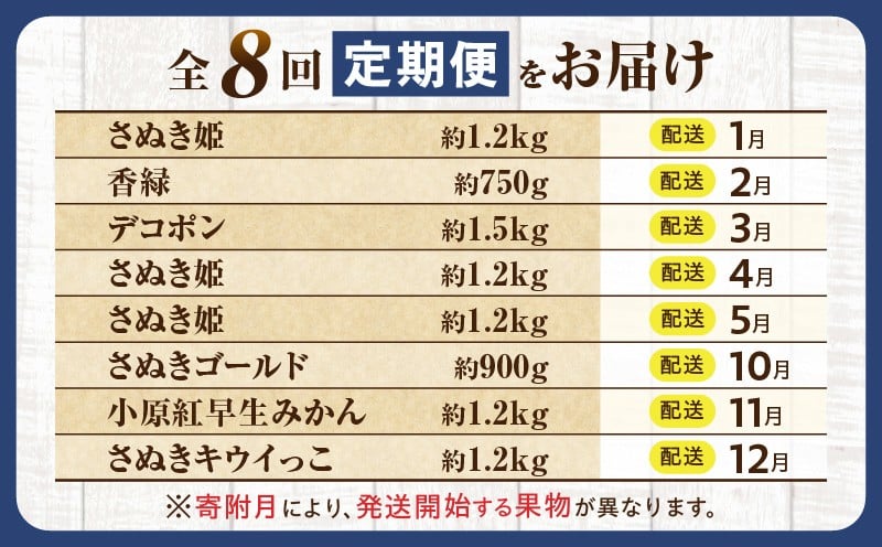 - とれたて果物 8回定期便A 果物 フルーツ 果物定期便 フルーツ定期便 定期便 いちご キウイ デコポンみかん 濃厚 旬の果物 定期 人気 おすすめ 贈答 贈り物 青果物 糖度 香川県 _mk165-t084