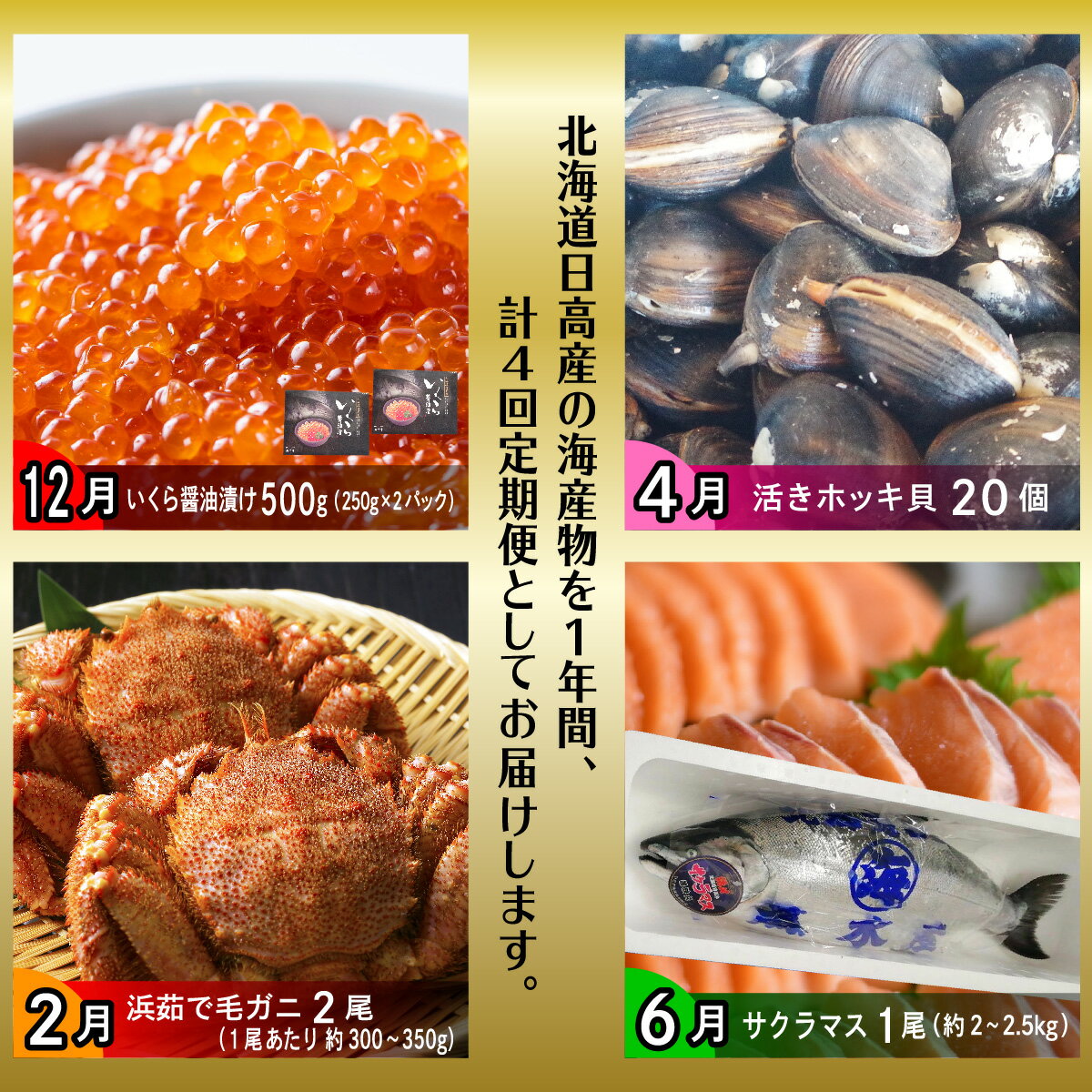 - 【ふるさと納税】 < 定期便 4回 > 北海道産 海の幸 毛ガニ ホッキ サクラマス いくら イクラ カニ かに 毛蟹 蟹 北寄 貝 さくらます ます マス 本マス さけ サケ 鮭卵 魚卵 旬 魚貝 海鮮 海産物 魚介 海産物 冷蔵 冷凍 北海道 新ひだか町 < 予約受付 >