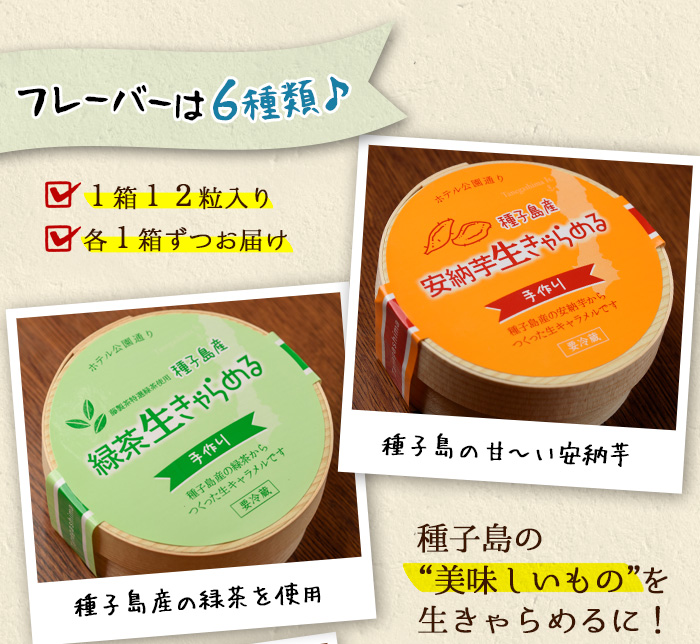 - n018 種子島の素材使用 生きゃらめる詰め合わせ(6種・各12粒入)【ホテルレストラン公園通り】