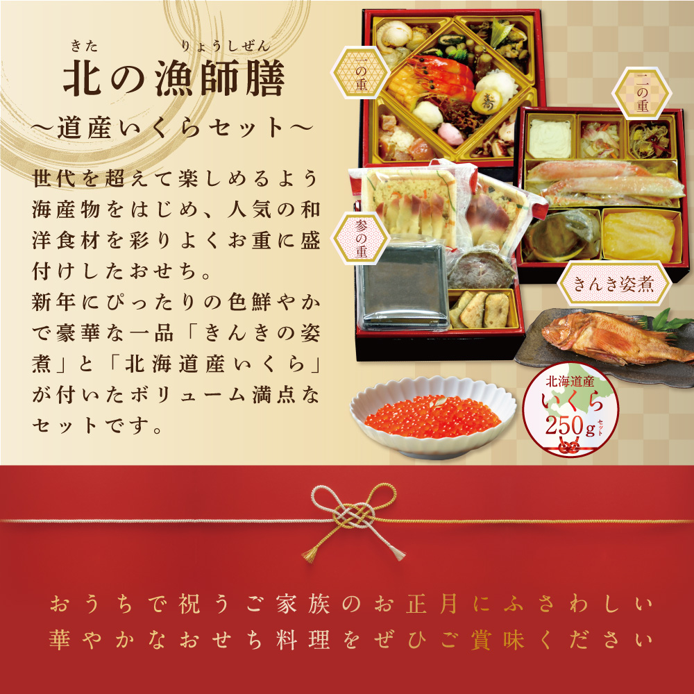- 2026 お正月 迎春 北海道海鮮 おせち 北の漁師膳(りょうしぜん) いくら(250g) セット 【KS000DANQ】( ふるさと納税 おせち ふるさと納税 おせち料理 ふるさと納税 お節 御節 海鮮 海鮮おせち )