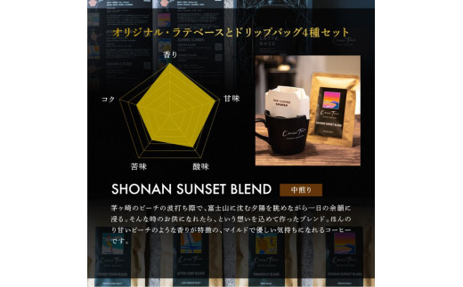 - 定期便 隔月 3回【茅ヶ崎のスペシャルティコーヒー専門ロースター】CRUISE TOWN COFFEE ROASTERS オリジナル・ラテベースとドリップバッグ4種セット