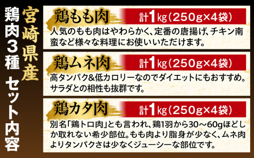 【最速便】宮崎県産鶏肉3種セット(総重量3キロ!)※小分け・カット済・真空冷凍_M146-003_01-2W