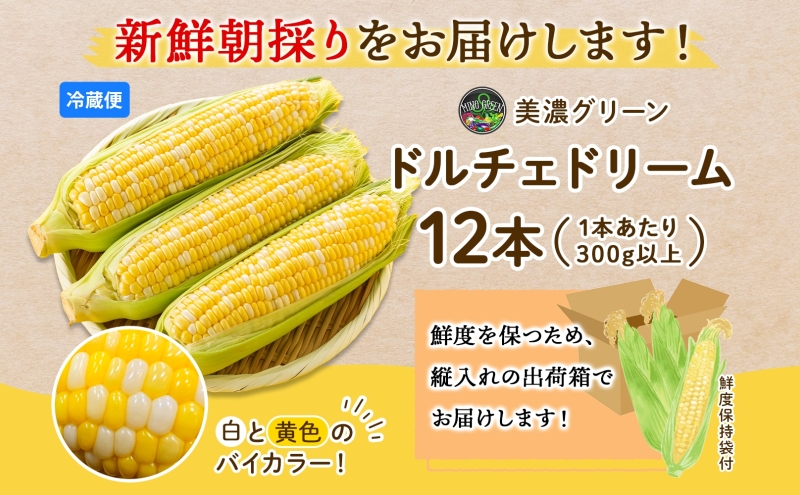とうもろこし ドルチェドリーム 300g以上×12本 約3.6kg コーン もろこし バイカラー 白 黄 低農薬 高糖度 18度 甘い ジューシー 野菜 おやつ 旬 産地直送 送料無料 美濃グリーン 岐阜県 美濃市
