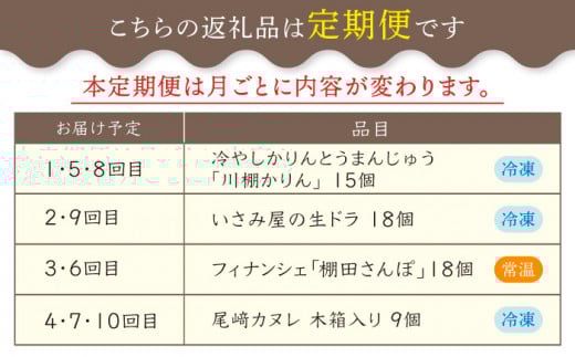 【10回定期便】毎月わくわく♪ スイーツ・菓子 定期便 いさみ屋を堪能!/ 和菓子 和スイーツ かりんとう饅頭 饅頭 まんじゅう 和 カリントウ どら焼き ドラヤキ 和風 どらやき 生ドラ 栗 くり饅頭 栗饅頭 栗まんじゅう フィナンシェ ふぃなんしぇ 洋菓子 カヌレ かぬれ そのぎ茶 彼杵 ほうじ茶 塩 すいーつ わがし おかし 茶菓子 ギフト 贈答 詰合わせ【菓舗いさみ屋】[OBB021]