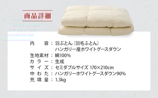 - IWATA 羽ぶとん(羽毛ふとん) ハンガリー ホワイトグースダウン セミダブルサイズ 羽毛布団 高級 AA010