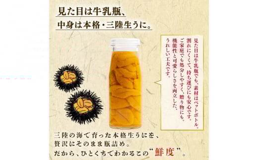 【期間限定】 生うに 牛乳瓶 風 135g ミョウバン不使用 ムラサキウニ 保存料 無添加 生食 うに ウニ 雲丹 数量限定 産地直送 岩手県産 冷蔵 季節限定 生雲丹 天然 海鮮丼 寿司 ウニ丼 刺身 国産 大船渡 三陸