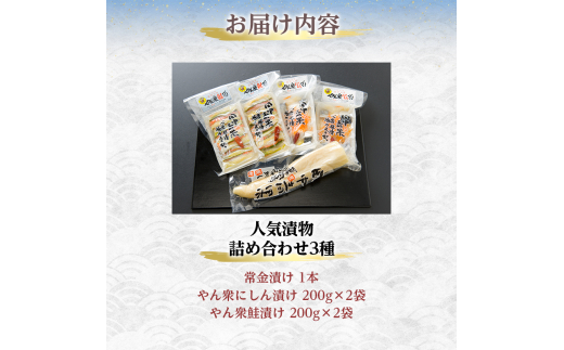 - 漬物 田中青果 漬け物 3種 セット 詰め合わせ A 常金漬け やん衆にしん漬け やん衆鮭漬け つけもの 野菜 惣菜 ご飯のお供 ごはんのお供 北海道 留萌