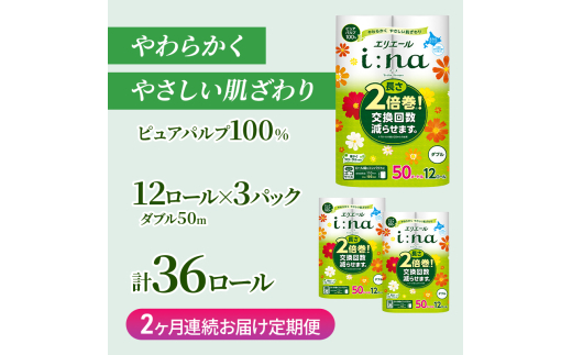- 定期便 2ヵ月連続お届け エリエール 【少量3パック】 [アソートS] i:na(イーナ)トイレットティシュー[ダブル 50m]12R×3パック(計36ロール) 2倍巻 長持ち ペーパー 防災 常備品 備蓄品 消耗品 送料無料 北海道 赤平市