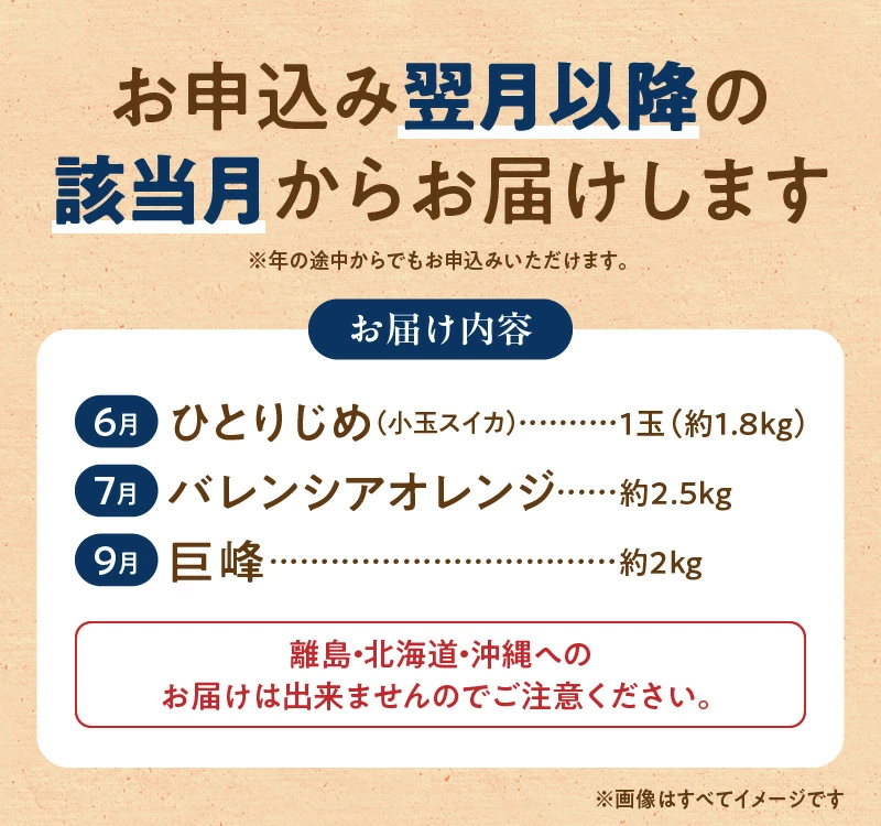 G60-T65_【定期便 全3回】紀州和歌山産旬のフルーツ定期便(スイカ、バレンシア、巨峰)