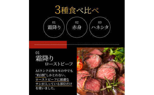 ローストビーフ 黒毛和牛 A5 3種 食べ比べ セット[ 霜降り 赤身 ハネシタ ( ザブトン ) 肉 牛肉 お肉 簡単調理 時短 小分け 個包装 ]