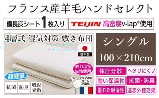 フランスウール・備長炭・V-Lap使用・4層式敷き布団【シングルサイズ】(KIK0029)《壱岐市》【くじめ屋】 [JFU003]