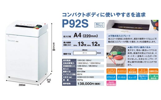 - 安心の国内生産 セキュレットシュレッダ P92S 業務用 家庭用 オフィス用 シュレッダー F21A-023