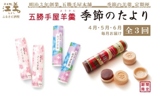 - 【早期予約】《3か月定期便》五勝手屋羊羹『季節のたより』全3回【令和8年4月~6月】毎月発送 期間限定ようかん 創業150年 五勝手屋本舗 保存料不使用 和菓子 銘菓 名物 贈答用 ギフト 五勝手屋さんの定期便