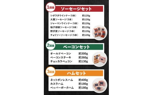 【3ヶ月定期便】頒布会・食べ比べ3ヶ月コース ウインナー ソーセージ ハム ベーコン 詰合せ セット バーベキュー キャンプ パーティー 手作り フランク オールポーク チョリソー ジャーマン ベーコンステーキ ボンレスハム 豚肉100% 天然腸 山梨県 白州 北杜市