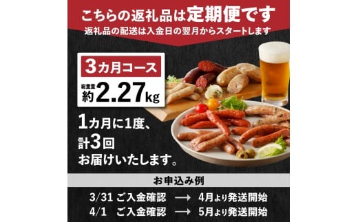 - 【3ヶ月定期便】頒布会・食べ比べ3ヶ月コース ウインナー ソーセージ ハム ベーコン 詰合せ セット バーベキュー キャンプ パーティー 手作り フランク オールポーク チョリソー ジャーマン ベーコンステーキ ボンレスハム 豚肉100% 天然腸 山梨県 白州 北杜市