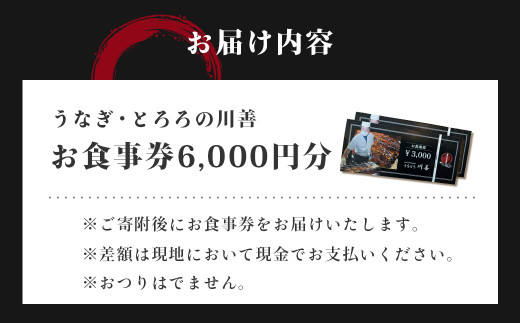 - 【うなぎ・とろろの川善】お食事券6,000円分 / 静岡県産鰻 鰻 ウナギ うなぎ とろろ とろろめし 天丼 秘伝のたれ 会食 宴会 白焼き 伊豆 静岡 食事券 020-019