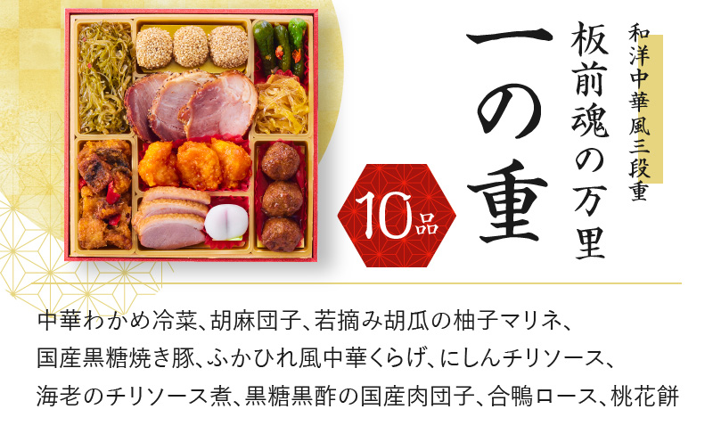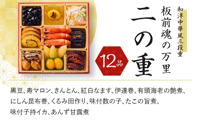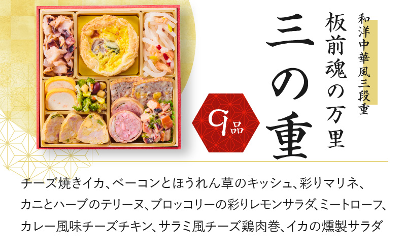 おせち「板前魂の万里」和洋中華風 三段重 6.8寸 34品 3人前 福良鮑&海鮮おこわ&豚の角煮 付き 先行予約【おせち おせち料理 板前魂おせち おせち2026 おせち料理2026 冷凍おせち 贅沢おせち 先行予約おせち 年内発送】