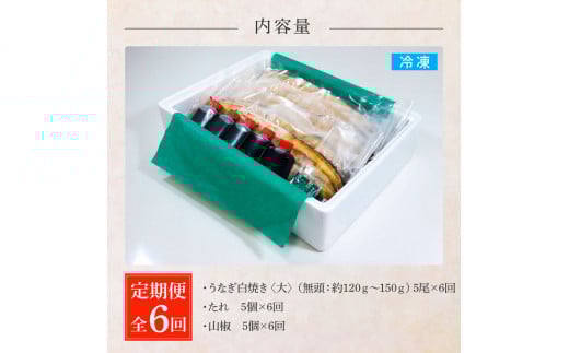 田野町産うなぎの白焼き(大) 5尾×6回 定期便 6ヶ月 定期コース 1尾あたり120~150g タレ付き 山椒付き うなぎ 鰻 ウナギ 白焼 無頭 おいしい 国産 個包装 お取り寄せ 冷凍 配送