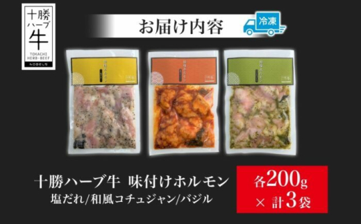 北海道 十勝ハーブ牛 味付けホルモン3種×各200g(塩だれ・和風コチュジャン・バジル)北海道産 焼き肉 やきにく ミックスホルモン 味付き 食べ比べ 肉 焼肉用 十勝 あしょろ 《足寄町》 【日本ふるさと創生株式会社】 [BEBB066]