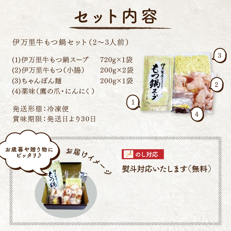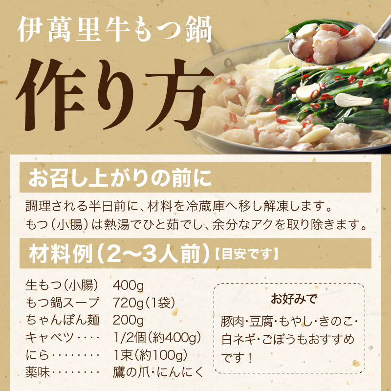 - もつ鍋セット 2人前~3人前 伊万里牛ホルモン400g スープ 麺 薬味付き J718