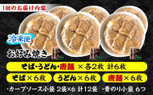 【全3回定期便】【冷凍】広島風お好み焼き うどん6枚(袋ソース2×6付) お好み焼 冷凍 ソース 広島焼 お取り寄せ そば うどん 唐麺 辛麺 広島 三次市/お好み焼き ナベちゃん [APBG038]
