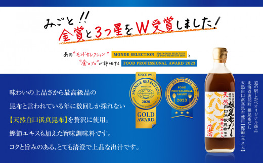 - 【北海道鹿部町産】天然白口浜真昆布使用 根昆布だし 500ml【モンドセレクション2020年金賞&FOOD PROFESSIONAL AWARD 2023年3つ星】