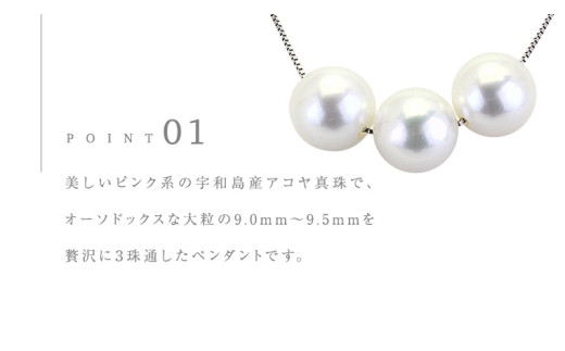 宇和島産 アコヤ真珠 (大粒9mm×3珠 美しいピンク系) スルーペンダント 普段使い ビジネスシーン ピンク パール 真珠 ペンダント 希少 結婚式 成人祝い 結婚祝い お祝い 入学式 卒業式 プレゼント ギフト 記念 贈り物 贈答用 アクセサリー ジュエリー ジュエリーマーノ 桜川市 [AH162sa]