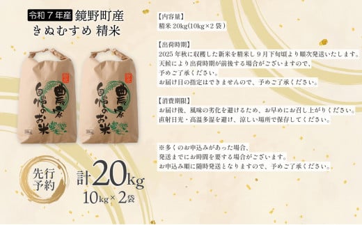 - 【先行予約】令和7年産 鏡野町産 きぬむすめ 精米20kg(10kg×2袋)【035-a005】