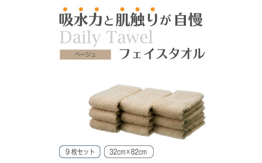 吸水力と肌触りが自慢のデイリーユースフェイスタオル ベージュ 9枚 泉州タオル ふんわり ふわふわ 吸水性 セット 日用品 大阪府 泉大津市 [4776]