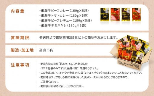 - 【7月発送】訳あり 飛騨牛レトルト4種20袋! バラエティセット 飛騨牛 肉 牛 カレー ビーフカレー トマトカレー ビーフシチュー デミハヤシ レトルト 20袋 簡易包装 レトルトカレー ご当地カレー おいしい 便利 飛騨高山 ふるさと清見21 DC001VC07