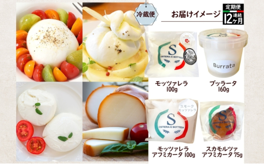 12ヶ月定期便 チーズ 4種 詰め合わせ 各1個 Osteria e Bottega S モッツァレラ ブラッターチーズ スカモルツァアフミカータ 神奈川県 茅ケ崎市 加工食品 乳製品 牛乳 手作業 ミルク 銀賞 幻のチーズ スモーク 塩漬け 美味しい おつまみ ピザ