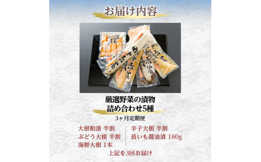 - 漬け物 定期便 3ヶ月田中青果 漬物 詰め合わせ B セット 5種 大根粕漬 ぶどう大根 海鮮大根 辛子大根 長いも醤油漬 大根 長いも 粕漬け 醤油漬け 野菜 大根の漬け物 ごはんのお供 おつまみ つまみ 惣菜 3回 お楽しみ 北海道 留萌 留萌市